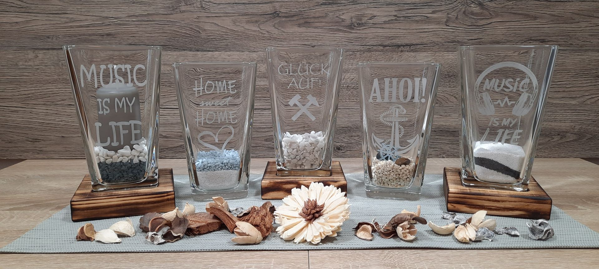 Lassen Sie sich von unseren schönen in Holz eingelassenen lasergravierten Dekogläser überzeugen.